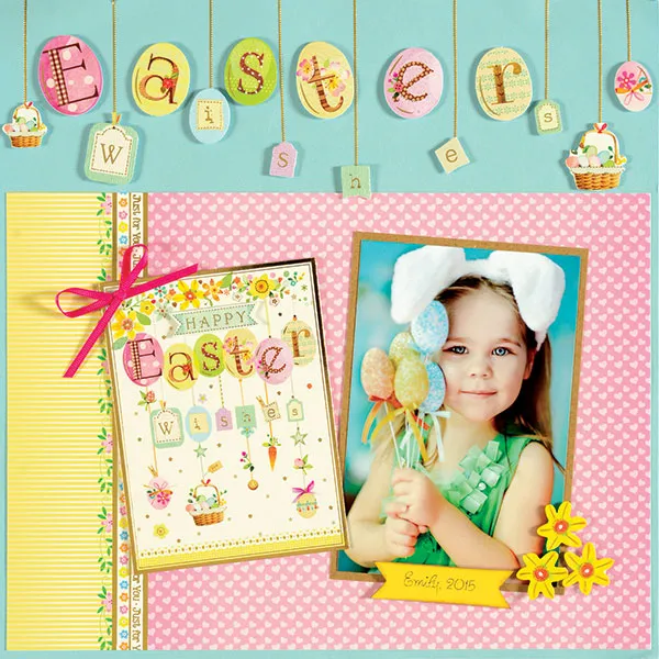 Mat the 4”x6” photo with kraft cardstock, leaving 1/8” borders and glue, angled on the right side of the page, as shown. Write or print on yellow cardstock and trace a banner shape using the “Happy” banner from the Easter Wishes die-cut sheet. Foam tape the journaling on the photo’s bottom edge and 3 die-cut flowers to the right corner. Foam tape the large “Happy Easter Wishes” die-cut rectangle angled to the left of the photo as shown. Foam tape the small “Happy” die-cut banner to the top. Use a length of dark pink 1/8” Grosgrain Ribbon to tie a bow and Zot™ to the top left corner.