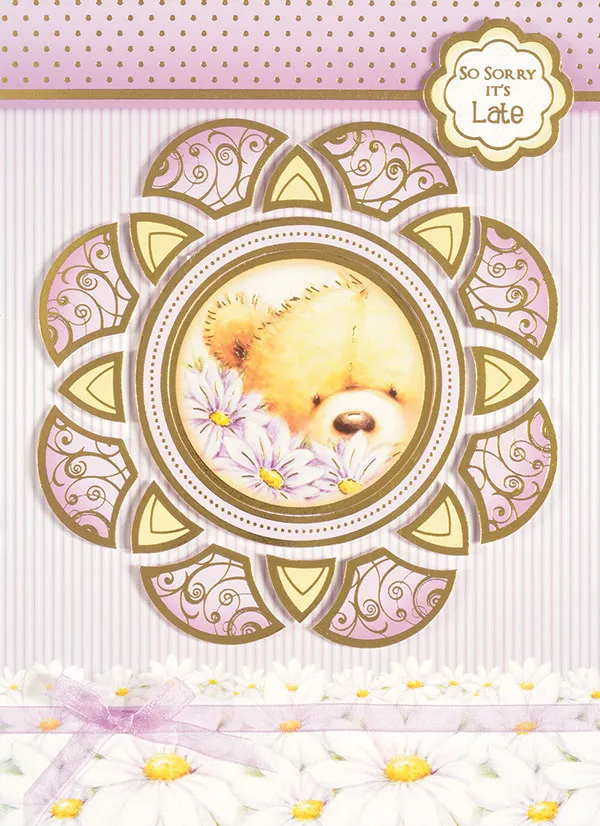 Glue a length of ¼” lilac sheer ribbon 1” from the bottom, tucking the ends under the edges of the cardstock, and Zot™ a bow on the left. Foam tape the “So Sorry It’s Late” label as shown.