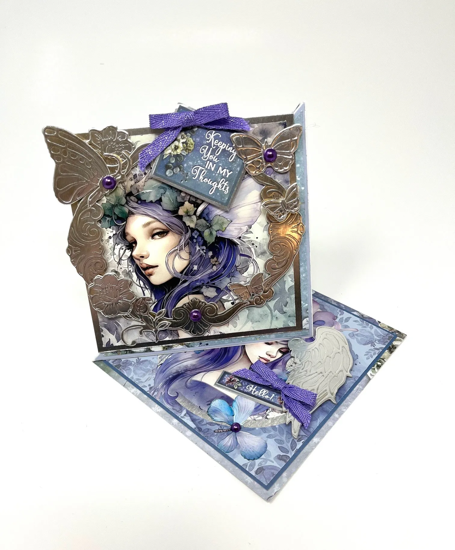Remove the large frame, flowers and butterflies from the Foiled Fancies. Use nail polish remover and a cotton ball to remove the gold finish to expose the silver layer. Foam tape them around the fairy's face. Place pearls as shown. Mat "Keeping You In My Thoughts" cutout on silver cardstock leaving a 1/16" silver border. Foam tape as shown. Make and Zot™️ a 1 1/2" wide purple bow above it.