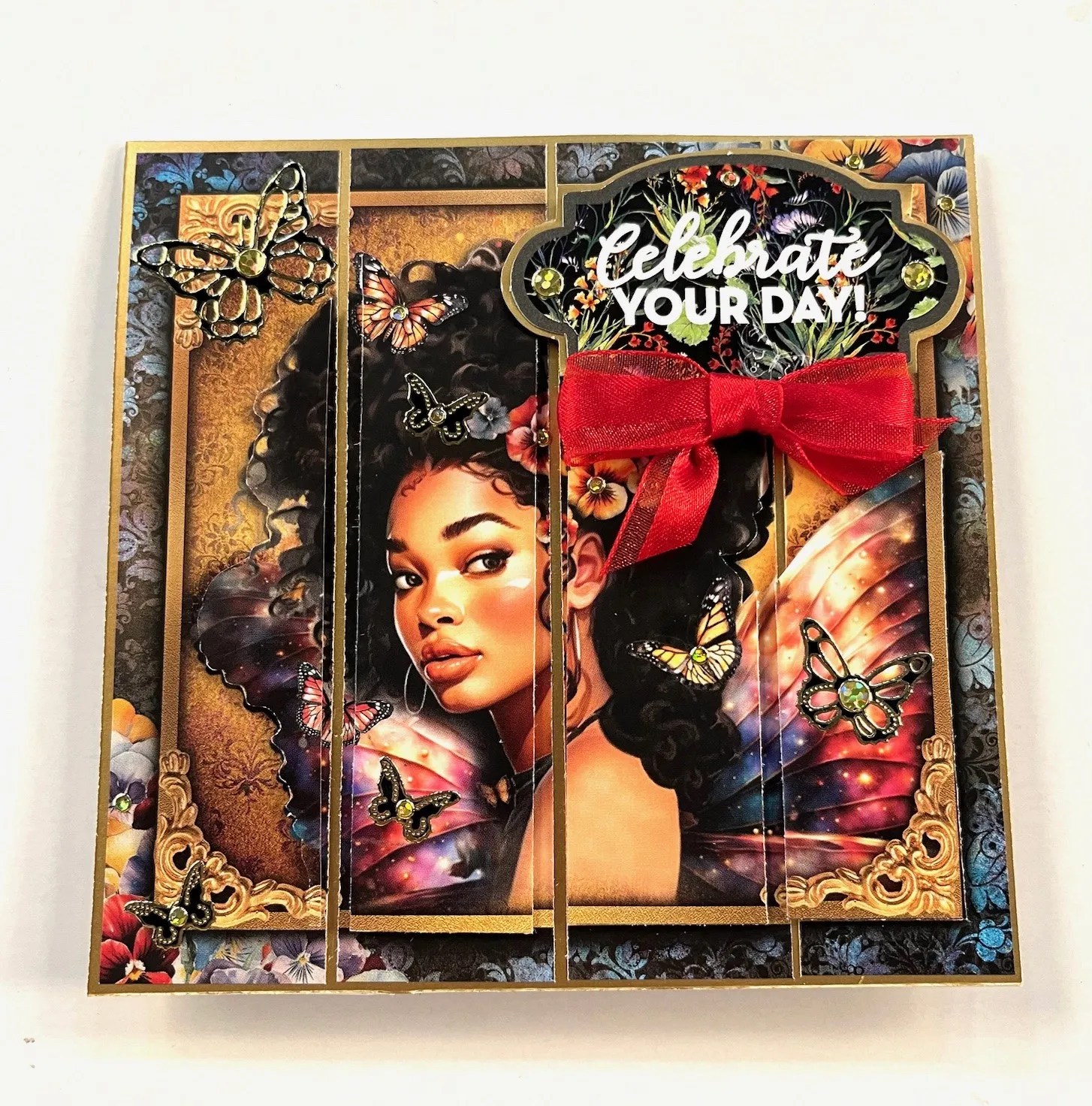 Take a white card blank and with the fold at the top trim to a 5"x5" card. Cover with metallic gold paper. Cut one sheet of the fairy paper into 1 1/8" vertical strips. Tape to the card leaving 1/16" gold borders between the strips and card borders. Cut a duplicate fairy into 1" wide strips and cut around the art. Then foam tape into each of the base strips. Mat "Celebrate Your Day" Flower Queen Die-Cut to metallic gold paper leaving a 1/16" gold border. Foam tape in upper right corner as shown. Make and Zot™️ a 2" wide red bow below it. Place gold Jewel Dazzles™️ and Gilded Butterfly Dazzles™️ stickers as shown.