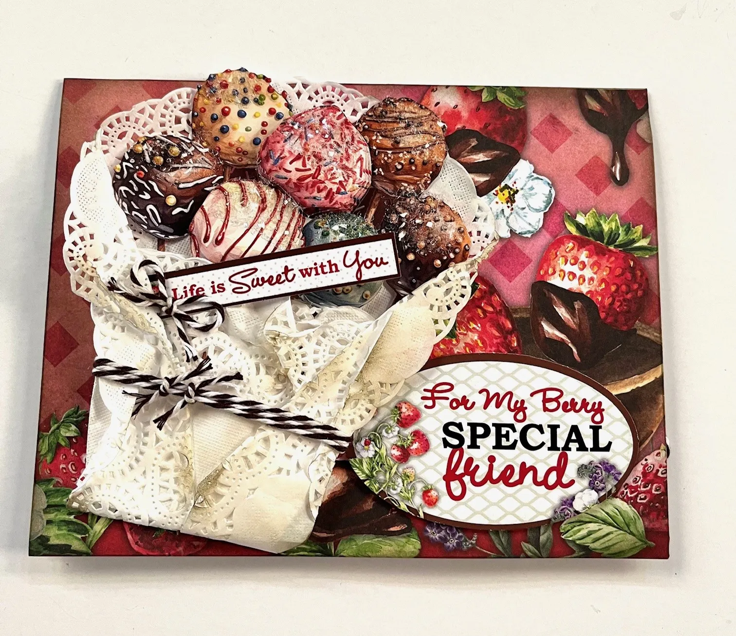 Position an oval doily vertically and glue the cake pops in the center top. Fold the bottom over the sticks of the pops and gather in the sides as shown; secure with tape or glue. Wrap brown baker's twine around it twice and tie two 2 1/2" lengths of twine onto it. With a 1/4" of 1/2" extra sticky tape attach the left end of the "Life is Sweet with You" Die-Cut into the doily then make and Zot™️ a 1" wide bakers twine bow as shown. With a blender brush lightly scuff up the doily with Velvet Fawn Prism Ink Pad. Secure to card front with 1/2" extra sticky tape. Foam Tape "For My Berry Special Friend" Die-Cut as shown.