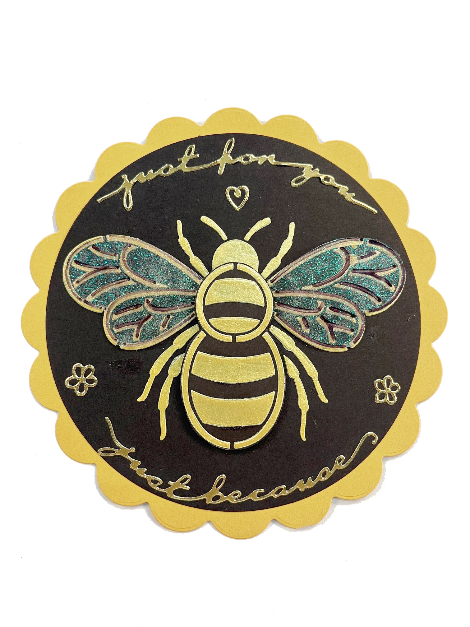 Place on a 6” square of black cardstock. Use the palette knife to spread the sunshine stencil butter over the bee. Use a smaller piece of black cardstock and spread the stencil butter over just the body portion of the bee. Let dry. Wash the stencil. Place the 5” circle cutting die over the stenciled bee, centering the bee. Cut with the die cutting machine. Cut the largest scallop circle out of yellow cardstock. Glue the bee circle to the center. Cut out the second bee body and set aside.