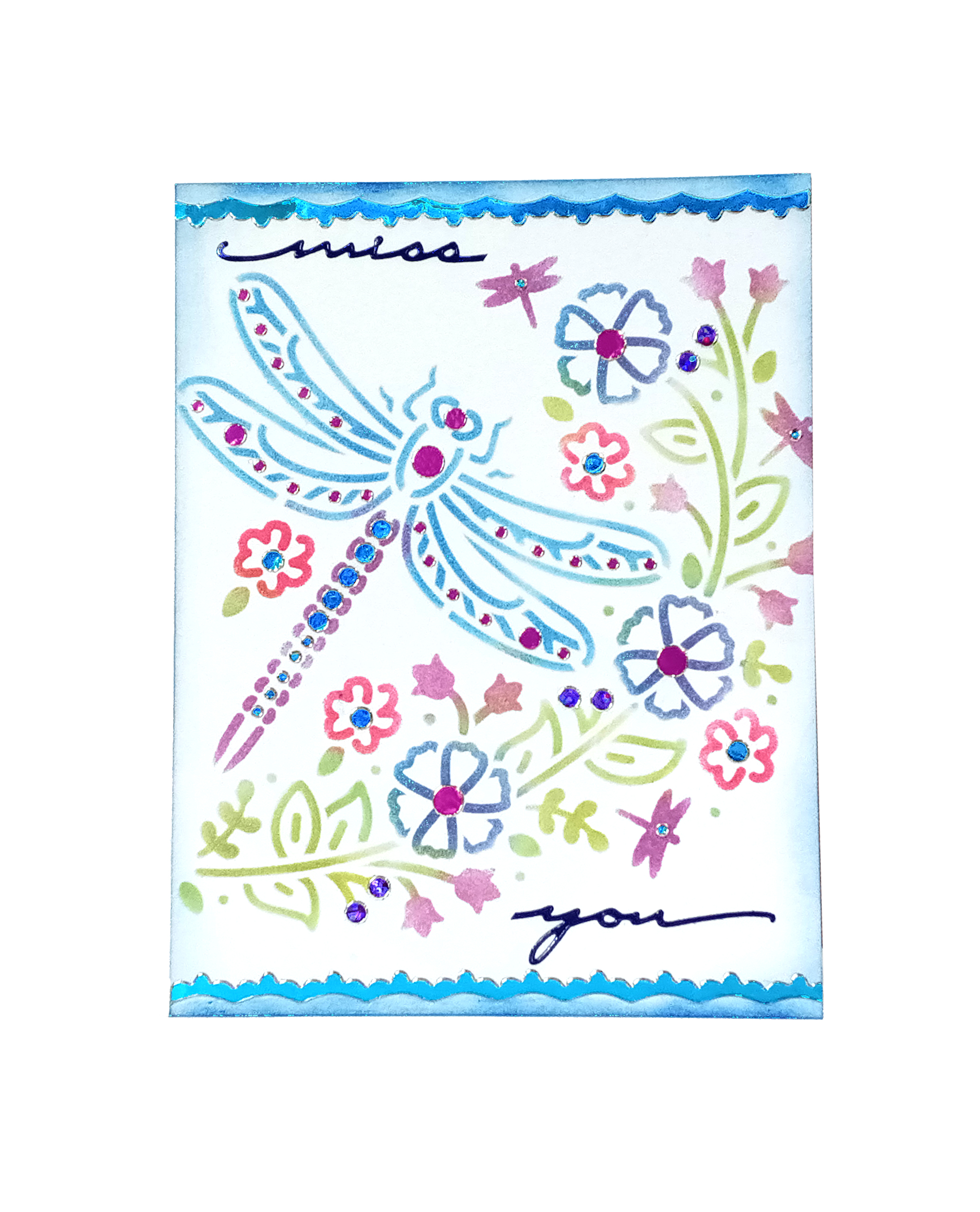 Stencil Dragonfly stencil to the card front and use a post it note to mask off areas when apply colors.