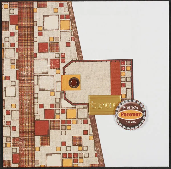 For the envelope back: Cut a 5" x 1½" piece of the plaid and glue it to the envelope flap. Trim off any excess. Cut a 5" x ½" strip of the squares paper and ink the edges. Glue it across the plaid piece, ¼" from the upper edge. Cut out the "best friends" bottle cap and glue it to the center of the lower plaid section, extending below the edge.