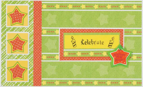Cut out three stars and glue them to yellow 1" squares. Mat the squares on white, then glue them evenly spaced to the plaid section. Cut out the blank label and stamp "celebrate" on it and a candle on each side. Mat it on orange dots, then on white and glue it centered on the green striped area.