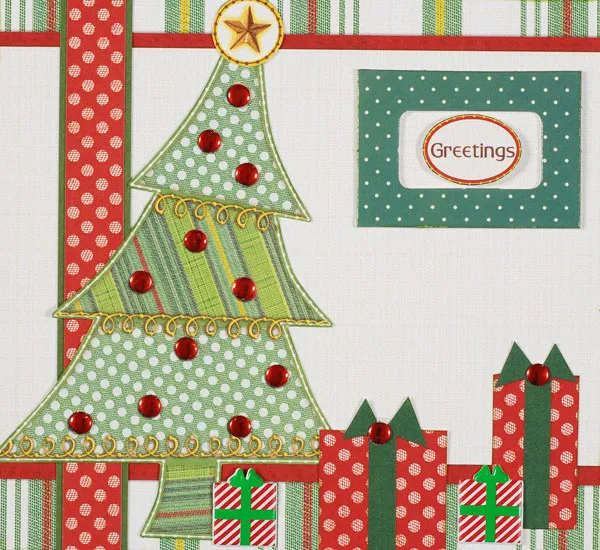 Cut a ½" x 5" piece of the red dots paper and mat the long edges with solid green. Glue it to the border piece, ½" from the left edge. Cut out the tree and glue it to the border piece, overlapping the dotted strip as shown. Cut out the gifts and glue them in place, then add the brad presents. Glue the constructed front to the blank card front.