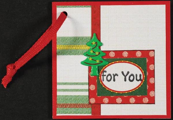 Cut out a blank oval label, including the green frame around it. Stamp "for you" in it, just inking those two words in the "just for you" stamp. Mat it with red dots paper and ink the edges. Glue the greeting to the border piece, positioned near the lower right corner. Add a tree brad as shown, then glue the piece centered on the gift card front.