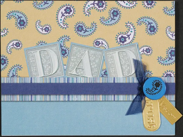 Punch out the silver letters for "dad" from the book and cut off the white edges. Mat each letter on light blue, then glue them to the front, positioned as shown with the lower edges tucked in the slit.