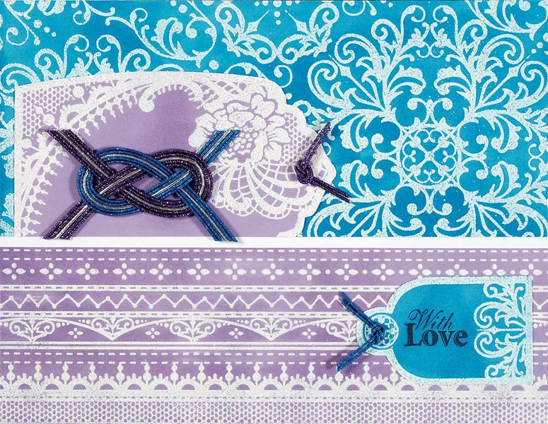 For the card front: Turn the card with the fold at the top and cut Color Me medallions paper to cover the front. Cut a 6½"x2" Color Me ribbons paper, then cut out the 3¾" Color Me lacy tag and 2" swirls tags. On the craft sheet, rub blue ink over the medallions paper and the small tag. Wipe off the excess ink with a paper towel. Rub purple ink over the ribbons paper and large tag. Let dry. Glue the medallions paper to the card and the large tag near the left side, 1" from the top as shown. Mat the upper edge of the ribbons paper on white cardstock with a 1/8" border. Glue to the front, aligning the lower edges. Stamp “with love” in black on the small tag and glue as shown.
