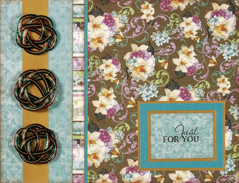 Place a gold cord between a brown and a teal cord and follow the directions in the book to make a Plum Flower Knot. Secure with wire. Repeat for three more knots, pulling the loops on one knot tightly to make it smaller. Brush glaze over the knots and let dry. Zot™ the three larger knots to the front on the gold strip. Stamp “just for you” on Enchanted teal paper and trim to 1¾"x1¼". Ink the edges, then mat on gold paper with 1/32" borders. Mat on teal cardstock with ¼" borders, then mat on gold with 1/32" borders. Glue to the card at the lower right.