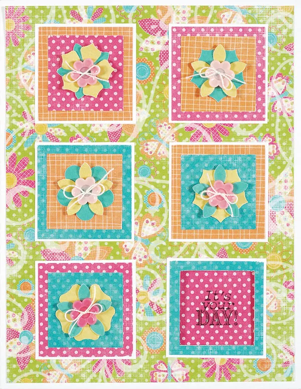 For the card front: Turn the card with the fold on the left. Cut 4¾"x6¼" Serendipity green floral paper and glue centered on the front. Punch two large and two small squares each from Serendipity turquoise dots, pink dots, and orange mesh papers. Glue a smaller square centered on each larger square, alternating the patterns. Mat each on white cardstock with 1/32" borders. Set aside the turquoise with pink square and glue the remaining five to the front as shown.