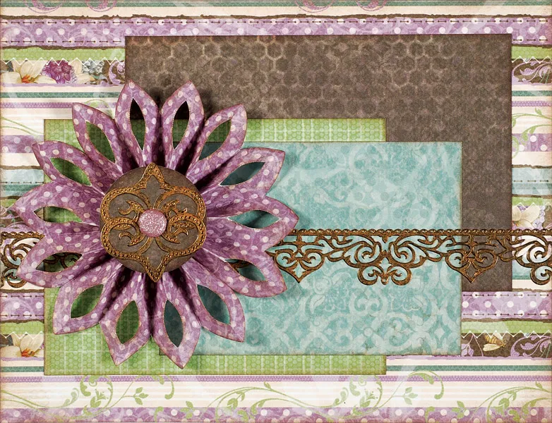 Trace and cut a Lacy flower from Enchanted lavender dots paper. Ink the outer and hole edges brown, then fold and secure with tape. Use ½" tape square to attach to the card. Place a second ½" tape square on the flower top. Punch an Enchanted brown net paper circle, ink the edges brown, and place the two Dazzle™ corners on it as shown. Insert the brad in the center, then place on the flower center.