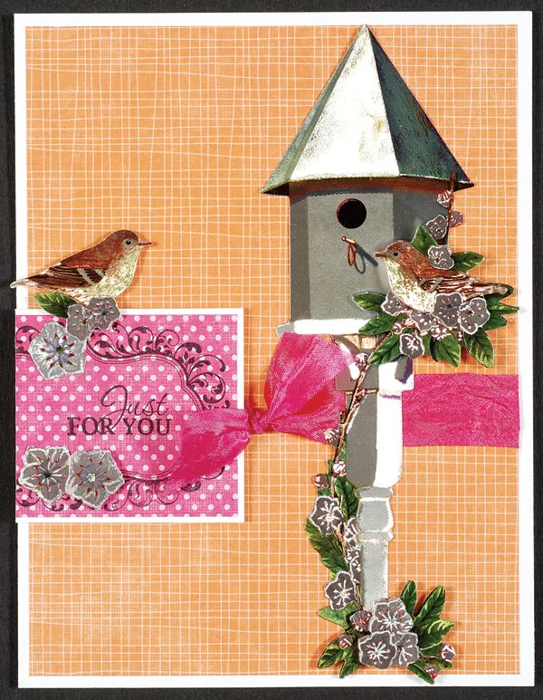 Punch out the silver set of die cuts. Glue #1 to the card as shown, then foam tape #2, #3, #5, #6, and #7 over the first image. Glue two extra flowers and foam tape one extra flower to the label. Foam tape the extra bird above the label and die cut #4 below it as shown.