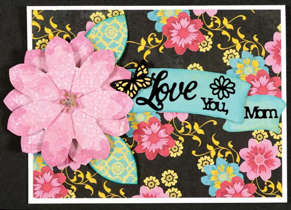 Zot the flower on the right of the banner. Glue leaves on the top and bottom of the banner, next to the flower. Place a Butterfly Dazzles™ on Mirage yellow, and cut close to the edges. Foam tape on the left side of the flower on the banner. Place the “Love you. Mom” Dazzles™ on the banner.