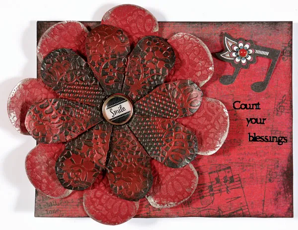 Flower: Follow the manufacturer instructions to make 1-S (5” dia) red cardstock flower, and 1-XS (4” dia) black glimmer paper. Before folding, run each through the Lace Border Embossing Folder. Keep the edge of the petal, even with the embossing pattern. (not the edge of the folder.) Ink the tips of the red petals with VersaMark™. Brush white Perfect Pearls on the tips. Ink the entire petals of the black glimmer flower with VersaMark&trade,; and brush with red Perfect Pearls. Curl the red flower petals up, and the black flower petals down. Add a “Smile” Rhapsody Embellies™ to the middle, and Zot to the Card front. Add The Music Embellies&trade,; and the “Count your blessings” Dazzles™ as shown.
