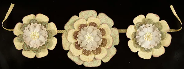 Assemble the large blossom flower and 2 smaller blossoms, as shown, using Ultra Tape. Apply brown chalk to three 4” doilies and tape one to the center of each blossom. Make three XXS 3” flowers from 1 ¾”x6” strips of Vellum Dots paper. Accordion fold and tape one flower to the center of each doily. Tape an ivory Dahlia to the center of each vellum flower.
