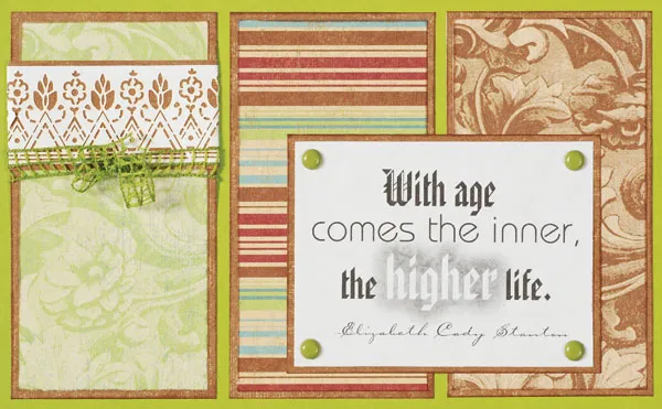 Cut the "With age…" quote to 2 7/8"x2 3/8" and add a 1/32" mat with the brown paper. Ink the edges then glue it across the lower portions of the two rectangles on the right. Add a green mini brad to each corner. Glue the constructed front to the blank card front.