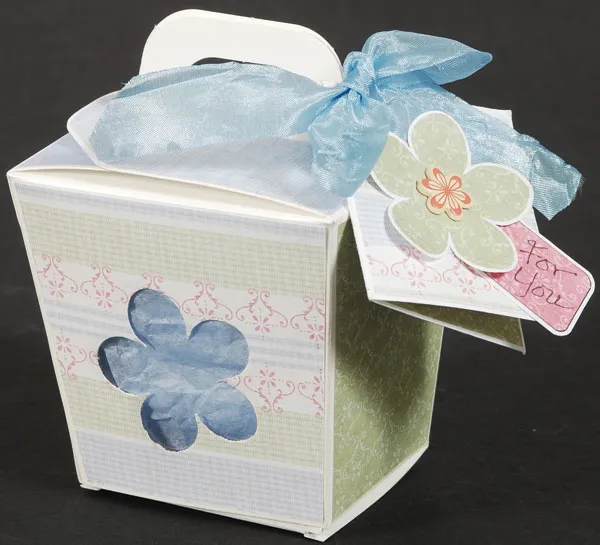 Slip the bottom edge of the section without a flap into the punch and position it in the center of the panel, then punch a flower. Cut a 2¼" acetate square and position it behind the open flower-shaped window. Glue the corners of the acetate to the box.