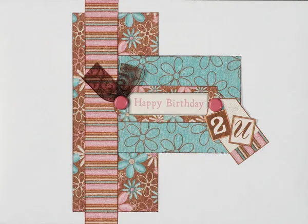 Cut out the "Happy Birthday" label, the tan/stripes tag, and the "2" and "U" from the sheets of art and alphabet tiles. Glue the birthday label on the teal flowers piece, slightly overlapping the striped piece.