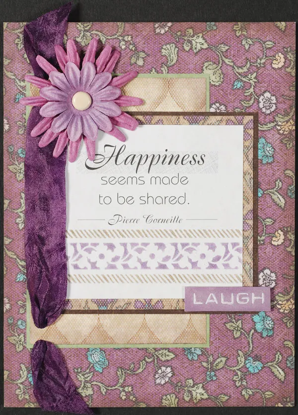 Chalk a 2" and a 1½" purple paper daisy with purple and pink chalks, adding touches of chalk to the outer petals and the centers. Stack the smaller daisy on the larger flower and use an ivory brad to secure them both to the constructed front above the quote as shown. Glue the constructed front to the blank card front. Cut out the "laugh" word art, add foam tape to the back and adhere it to the lower right corner of the quote.