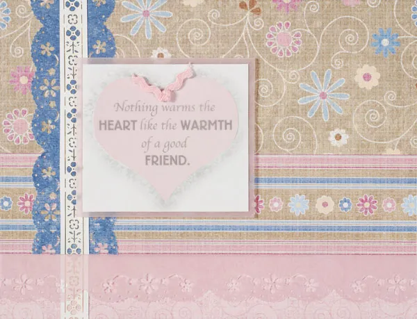 Cut the "nothing warms the heart…" quote to 2½"x2¼". Lightly trace the heart onto the pink vellum, cut it out, then erase any lines on the heart. Use vellum adhesive to glue the vellum heart over the heart on the quote. Mat the quote on vellum, leaving a 1/16" wide mat. Add foam tape to the back, then adhere it to the front, slightly overlapping the laser border. Knot a 2" pink rickrack length and glue it at the top of the heart.