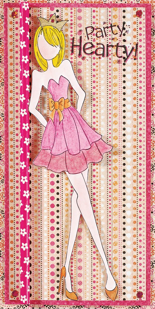 Cut a 3 1/2”x7 1/2” dotted stripe Grapefruit paper and mat on dark pink Grapefruit paper with 1/8” borders. Stamp “Party Hearty!” in dark pink ink and then in black ink 3/8” from the right and 1/2” from the top.