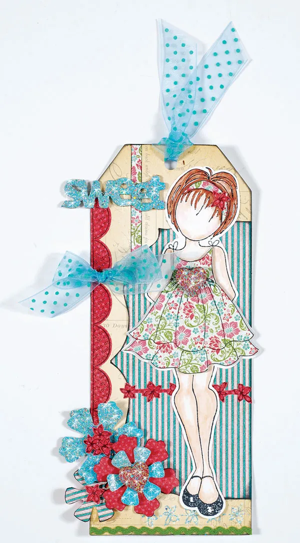Trim individual flowers from remaining Rosemary & Thyme dark pink stamped floral border and foam tape to flower centers and doll’s hair band as shown. Cover 2 chipboard hearts with Rosemary & Thyme dark pink paper and trim edges evenly. Ink the paper covered hearts with VersaMark&trade,; sprinkle with vintage pink embossing tinsel, and emboss. Zot™ one heart centered on the doll’s belt, and the other centered on the layered flowers. Ink “sweet” chipboard word with VersaMark&trade,; sprinkle with vintage blue embossing tinsel, and emboss. Glue to the upper left edge of the tag. Tie a bow with blue sheer dotted ribbon and Zot™ to the tag as shown. Tie the top with ribbon. Glue green rick rack along the bottom of the tag, trimming edges evenly.