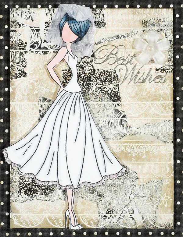 Cut out the girl. Tie a knot in a 3" White Truffle white crepe ribbon and Zot™ the knot underneath the tails and then to the girl's head as shown. Zot™ the tails behind her head and trim to look like a veil. Foam tape the girl to the card as shown.