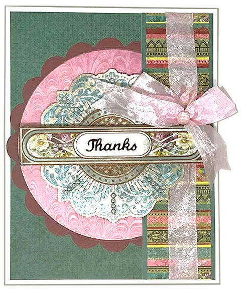 1. For the card front: Place the card with the fold on the left. Cut 4¾"x6¼" dark teal paper and glue it centered on the card front. Die cut a 4½" circle from pink marble paper and glue it centered on the front. Die cut a 5" scalloped circle from burgundy cardstock, then die cut a 4½" circle from the center of it. Glue it as a frame around the pink circle.