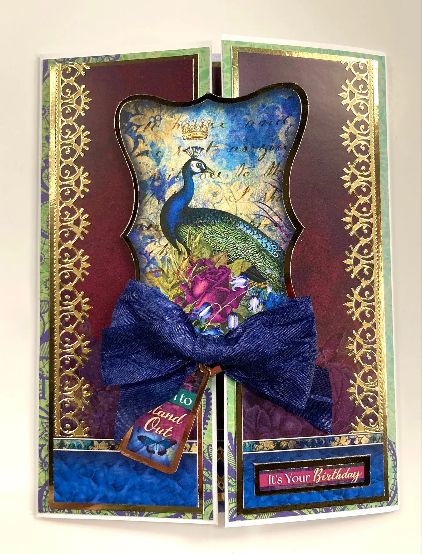 Select the peacock card and cut out the card base. Cut it in half along the score line. Cut one piece in half and glue over the gold Mirri leaving 1/16" gold border. Save the other half for the inside. Place Border Dazzles™️ on the outer purple edges of the cut pieces. Foam tape the peacock image on the left side only in the center of the gates. Zot™️ the tag on the lower left. Make and Zot™️ a 3" wide blue bow below the image. Glue "It's Your Birthday" tag on the lower right as shown.
