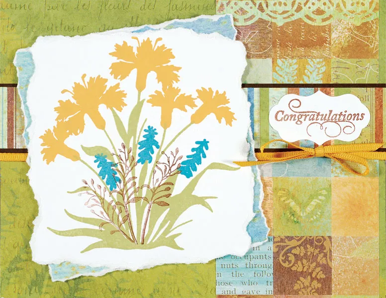 Stamp flowers and leaves as shown on 4”x4 1/4” white cardstock and tear the edges. Tear the edges of a 4”x4 1/4” blue watercolor paper. Glue the white to the blue offset as shown and foam tape to the left side.