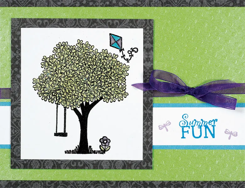 Stamp the tree image on white cardstock with Versamark™ ink. Sprinkle with black embossing powder and tap off the excess. Melt the powder with a heat gun and let cool.