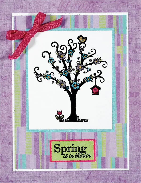 Stamp a spring tree with VersaMark™ ink and sprinkle with black embossing powder. Tap off the excess and set with a heat gun. Once the image has cooled, color in with Smooch™ inks in Lettuce, Plum Berry, Sassy Pink, and Pool Blue as shown.