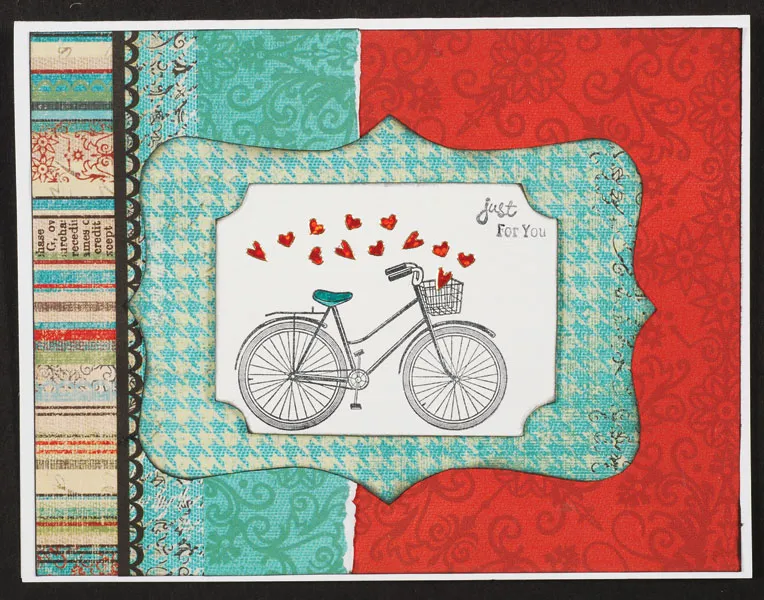 Stamp the bike onto white cardstock and trace with the Vintage Sign template image and ink the edges black. Stamp “Just For You” at the top right corner. Color the bike seat with blue marker. Place tiny heart Jewel Dazzles™ to extend from the bike basket as if floating out. Foam tape the Vintage Sign shape to the center of the large label.