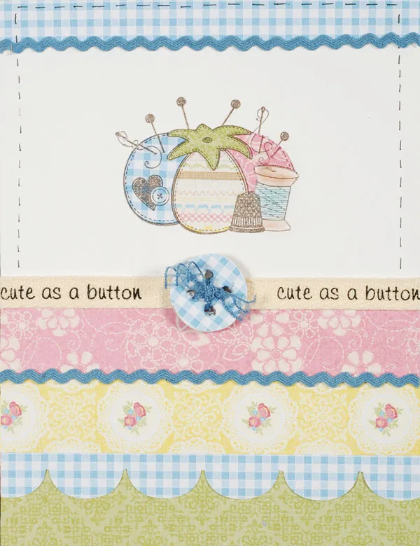 Inside: Glue a 5”x1” length of blue gingham to the inside bottom edge of the card. Stamp “Sew Sweet” above the gingham border. Glue a length of rick rack across the paper border edge. Cover a square chipboard button with pink floral paper. Poke new holes and sand edges. Thread with grid ribbon and glue to the right side of the rick rack.