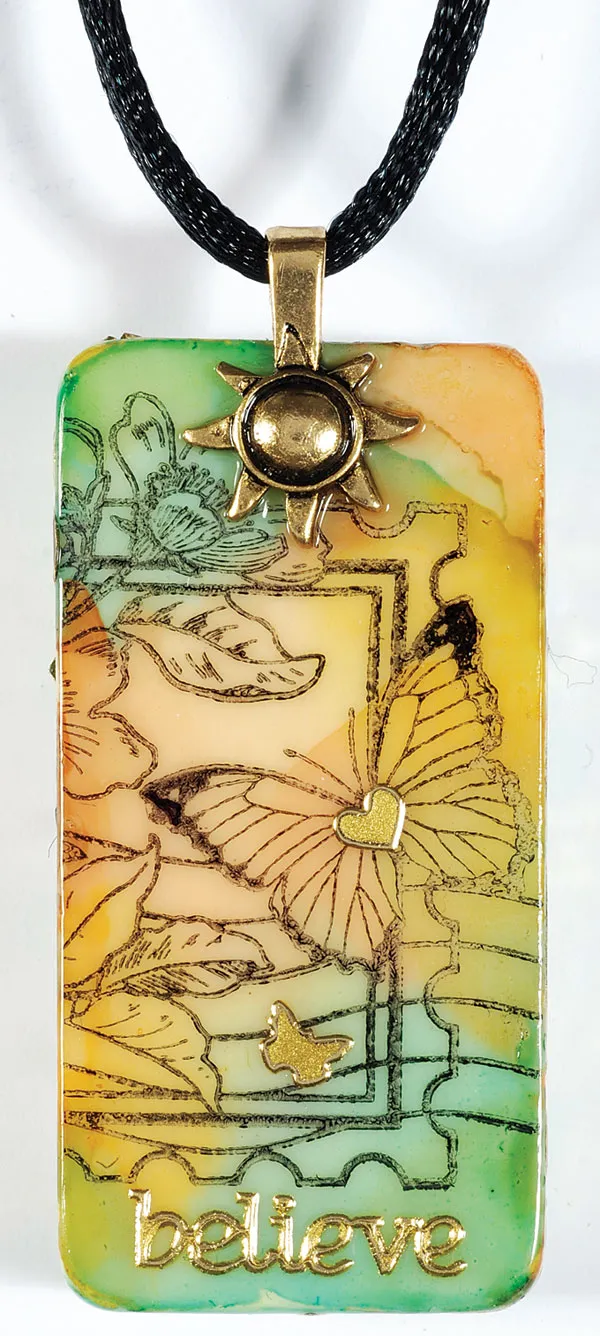 Glue the sun bail to the top front of the domino using Crystal Lacquer. Use the paintbrush to apply a thin coat of Lacquer to the entire domino and let dry for several hours before hanging from the satin cord.