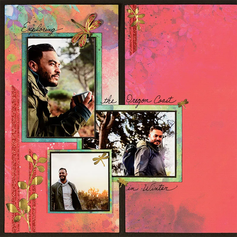 Step #2 PHOTOS: Left page: Use a wedge to ink the edges of 4”x5 ½” green mottled paper and glue 1” from the left and 1 ¾” from the top. Mat a 5”x3 ½” photo on black cardstock with a 1/16” border, then on green mottled paper with a ¼” border, ink the edges and glue overlapping the green paper by 1&rdquo,; as shown. Mat a 3”x3” photo on black cardstock with a 1/16” border, then on green mottled paper with a 1/8” border, ink the edges and foam tape over the lower left corner of the center photo. Mat a 3 ½”x5” photo on black cardstock with a 1/16” border and foam tape centered over the upper green paper, as shown. Right page: Mat a 6”x4” photo on black cardstock with a ¼” border, then on green mottled paper with a 1/8” border, ink the edges and glue 1” from the left side, 2 ½” from the bottom of your page.
