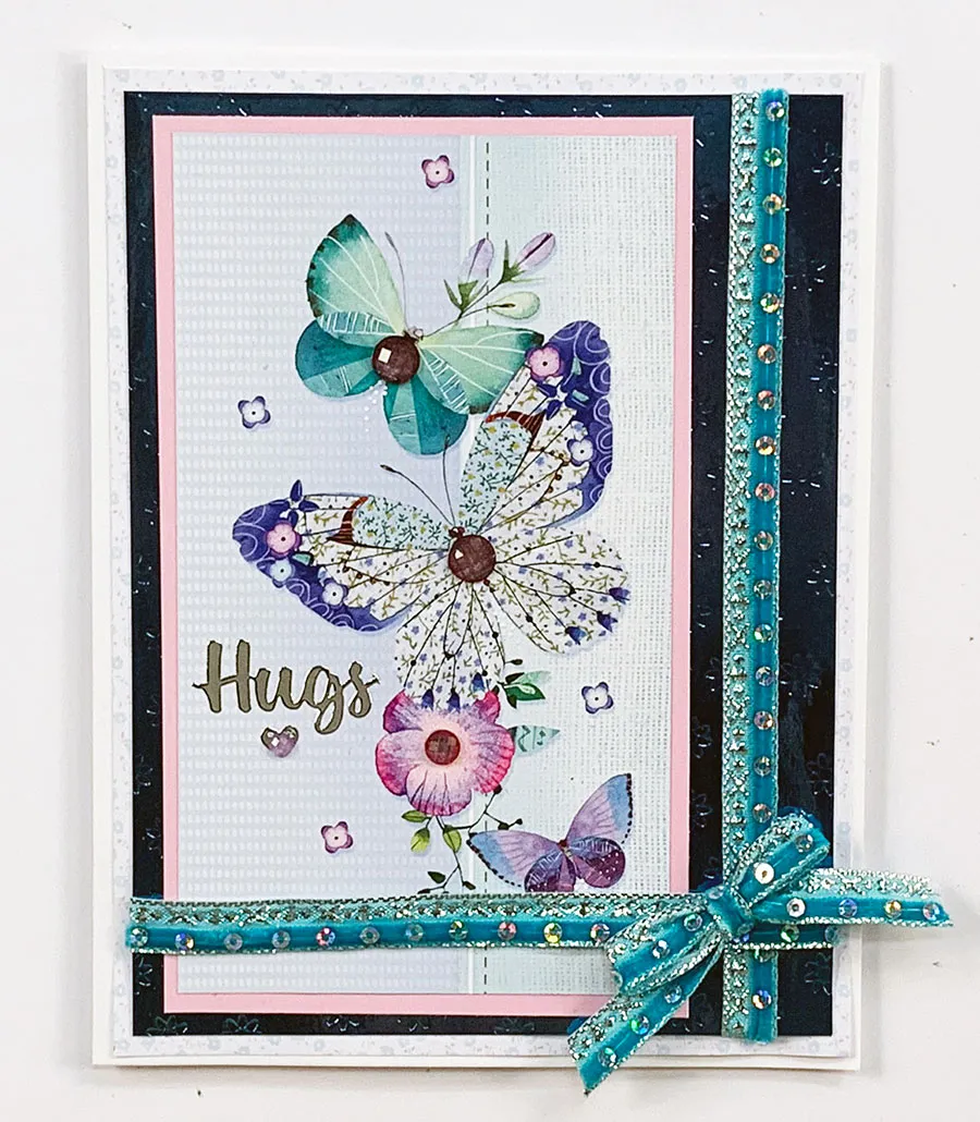 Cut butterfly from 8”x8” Pad to 3 1/8”x5.5” and mat on pink Adorable Scorable with 1/8” borders. Glue on the left side of 4 1/2”x6” Mirri Textures. Wrap and glue aqua ribbon as shown. Mat on 4 3/4”x6 1/4” blue flowered insert sheet and glue to the card front. Zot™ a bow where the ribbons intersect. Add Dazzles™ and purple Sparkles as shown.