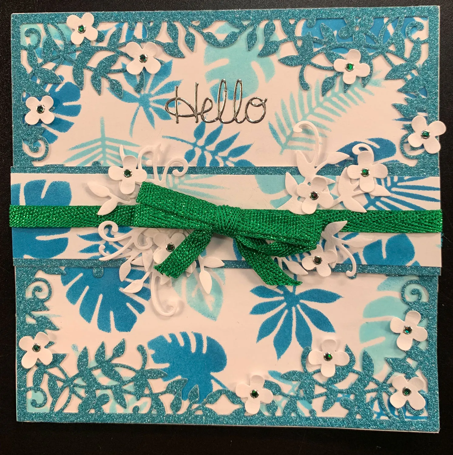 Trim a blank card down to 5” square. Cut a piece of white cardstock to 5” square. Using a craft sheet tape the stencil over the paper and fill in the leaves with the blue inks varying the colors. Apply ink using the stylus and pads. Once dry glue to the card front.