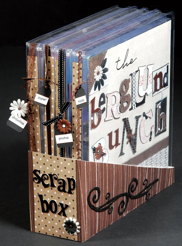 Cover the storage box with brown stripe paper. Cut a 3 ½"x6" strip of brown dot paper and glue to the front of the storage box. Add "scrap box" thickers and black and white flowers attached with a brad to the dot strip. Attach black swirl felt ribbons to each side.