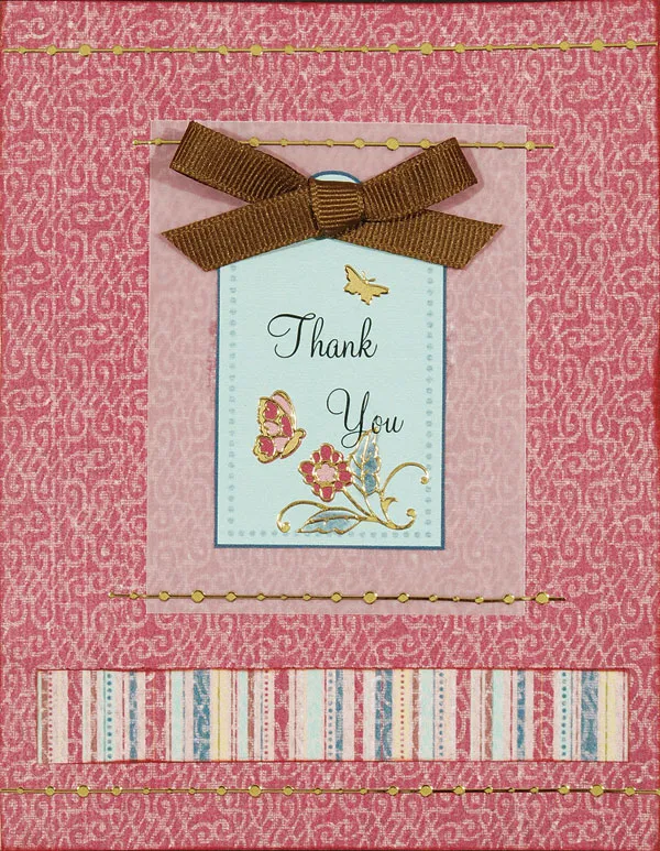 Print “Thank You” on the tag and decorate with butterfly and flower Dazzles™. Glue the tag with a bow on top to the center of the vellum.