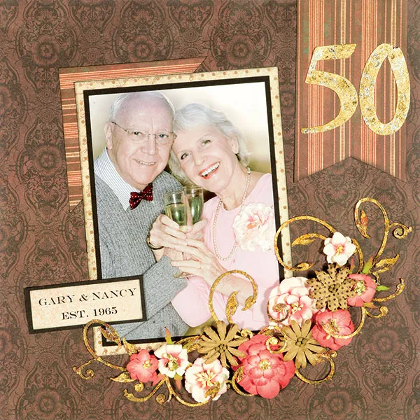 Die cut two Viney Swirls from kraft colored cardstock and apply FlitterGlu to one vine at a time. Sprinkle with Mulled Wine Gilding Flakes and lightly buff away excess flakes with Scoochy pad. Glue one vine across the bottom right photo corner. Cut the largest swirl from the 2nd vine and glue the remaining vine across the bottom of the photo. Zot™ antique red and craft brown flowers among the swirls, lifting ends of the swirls and curling over the flowers as shown. Zot™ the largest swirl and under the flowers near the center of the cluster as shown.