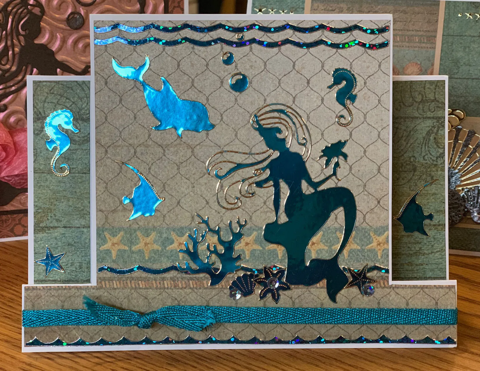 For the card front: Trace the front and side patterns found in the card packaging. Cut the front from Seaside border netting with the border on the bottom. Cut the side patterns from Seaside teal boards papers and glue to the side panels.