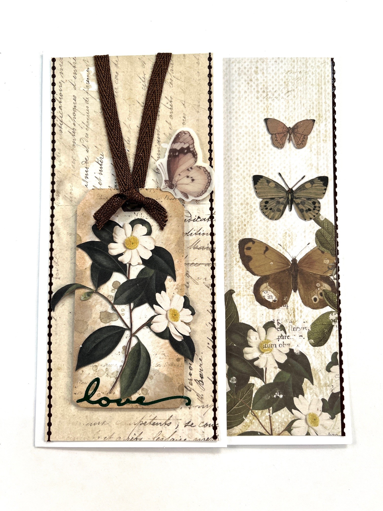 2. Glue brown ¼” ribbon in a “V” from the tag to the top of the script paper. Zot™ a knotted ribbon at the top of the tag. Glue the floral laser cut spray on the tag. Place “love” from the green script Dazzles™ at the bottom of the tag. Foam tape the side butterfly vellum die-cut at top left tag’s shoulder. Place brown thin line Dazzles™ on each long side of the script paper.