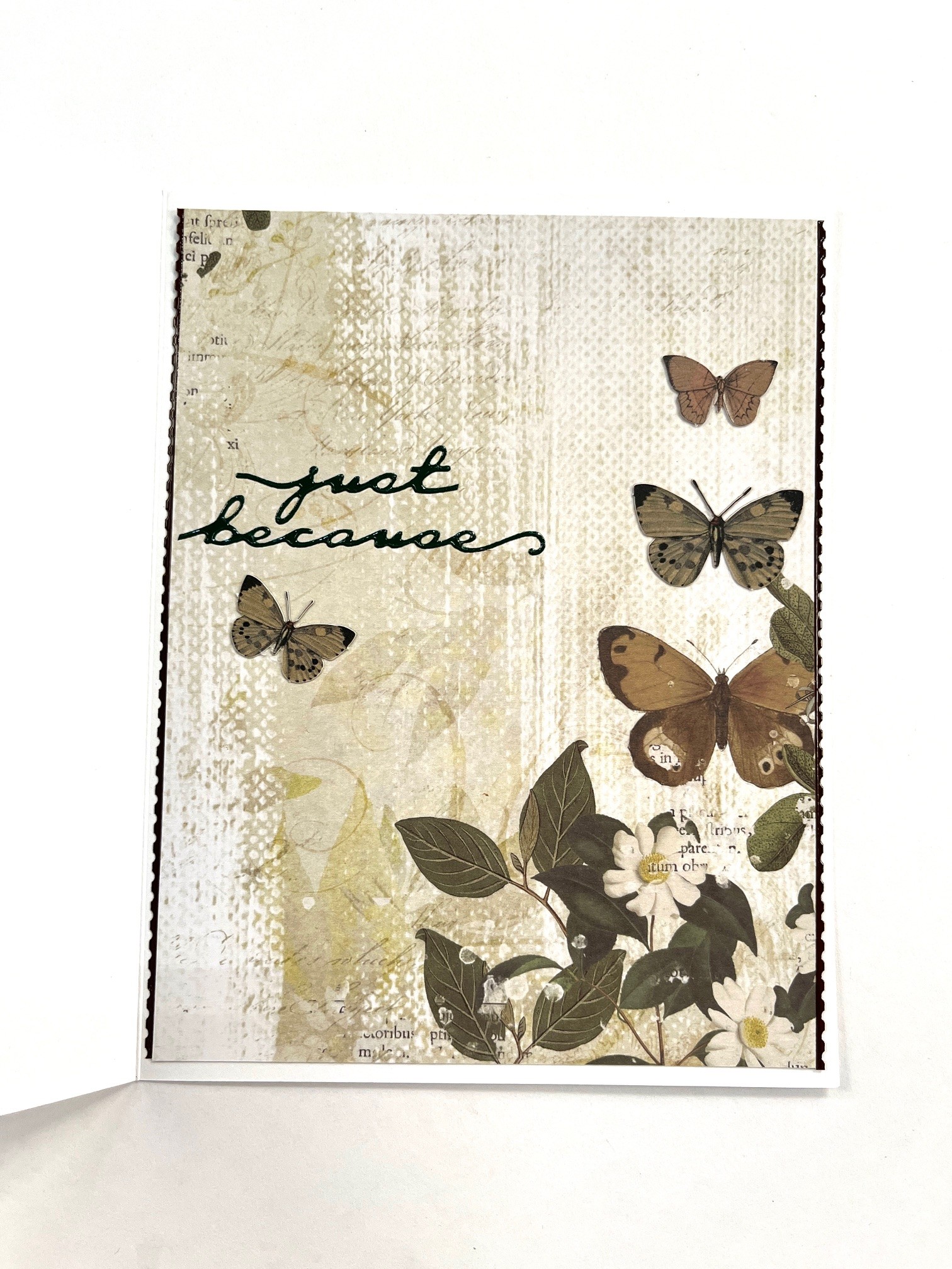 3. Inside: Glue 4 ¾”x6 ¼” corner floral paper to the card. Place brown thin line Dazzles™ on each long side of the paper. Glue three butterfly laser cuts as shown. Place green “just because” Dazzles™ near the fold.