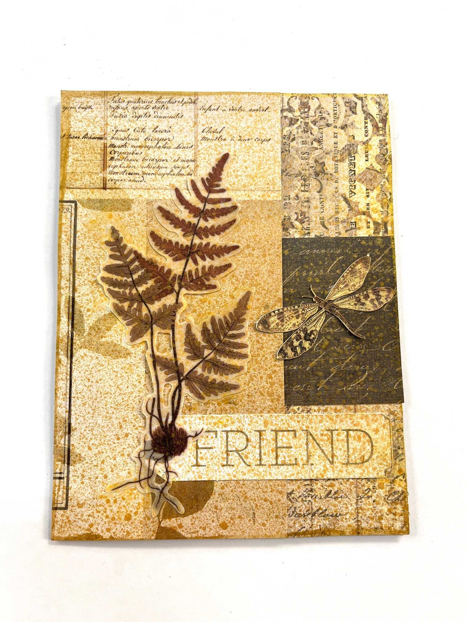 1. Glue 2 ½”x6 ½” collage sheet on the left side of the card front. Glue 5”x2 ½” black script paper in the center. Glue 3 ½”x6 ½” leaf collage paper on the left side of the card.