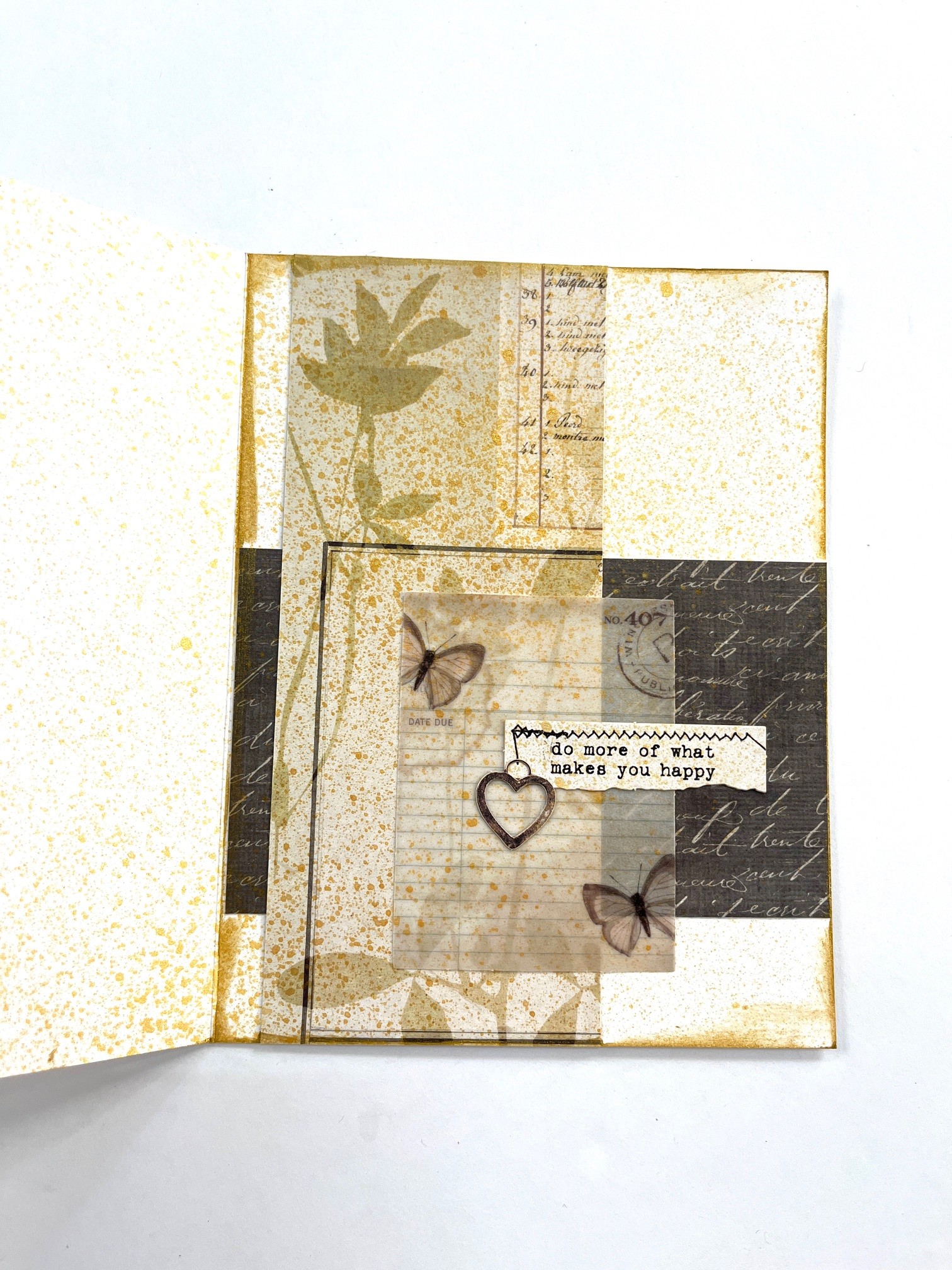 4. Inside: Glue 3”x5” black script 1” from the card bottom. Glue the rest of the leaf paper from the card front ½” from the fold. Glue the butterfly rectangle vellum die-cut as shown. Glue the message from the paper pad as shown with a heart laser cut “hanging” from the thread.