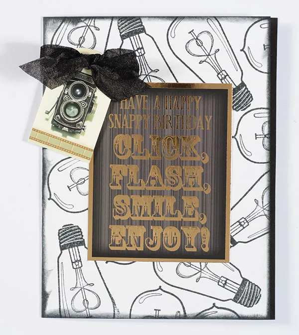 Card Front: Place the card with the fold on the left and cut 1/8” from the right edge only. Randomly stamp light bulb, altering directions and extending off the card edges. Ink the card edges and glue the “Have a Happy, Snappy Birthday…” Fan-Tash-Tique Hunkydory die-cut to the card center. Foam tape the camera tag to the top left and use ¾” wide crepe ribbon to make a bow. Zot to the tag.