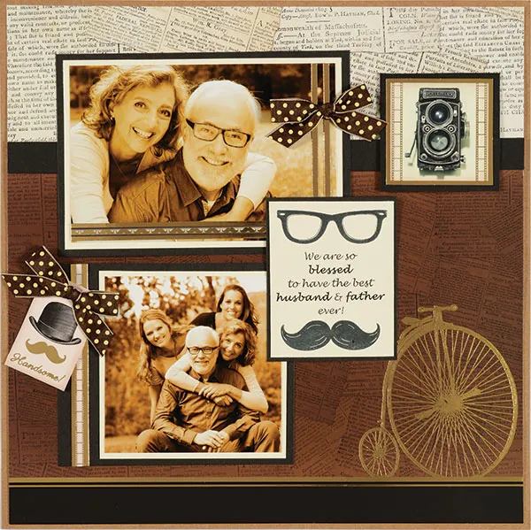 Journaling: Write or print sentiment on ivory cardstock and stamp black mustache and glasses above and below the journaling as shown. Cut the cardstock to 2¾”x3½” and mat with black cardstock, leaving 1/16” borders. Glue to overlap the right sides of photos as shown. Mat camera die-cut on black cardstock with 1/8” borders and foam tape to the right side of the black cardstock border as shown.