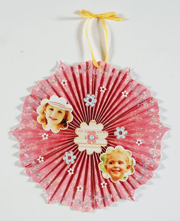 Cut out 3 blue gingham small flowers and ink the edges. Apply pink Jewel Dazzles to the centers and hot glue them around the photos. Apply pink Jewel Dazzles™ to 9 punched daisies on the white side and hot glue them scattered around the pleated flower.